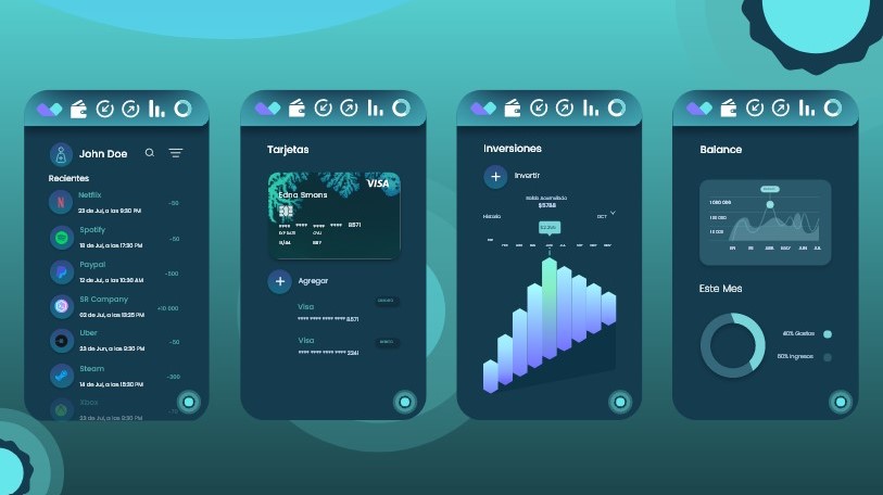 Prototipo de interfaz gráfica para un monedero virtual, aplicando fundamentos de UI design.